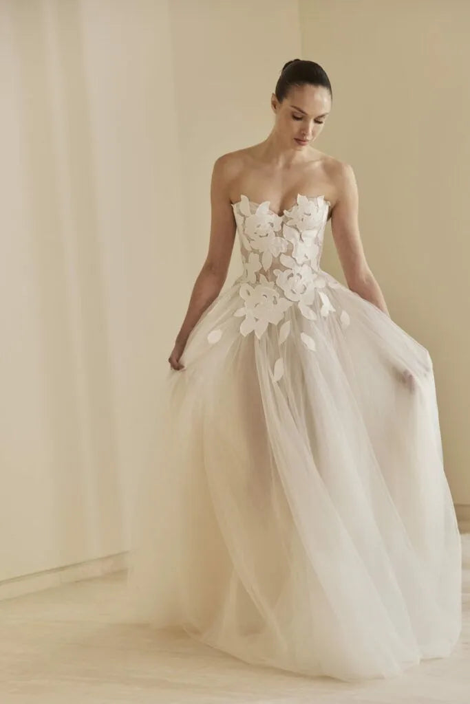 Mira Zwillinger's approach is a celebration of elegance, timeless glamour and supreme craftsmanship. Using the finest fabrics and materials sourced from Milan and Paris, combined with a meticulous attention to detail, Mira creates eye-catching couture collections without any compromise, each with their own story. Every one of Mira’s designs is meticulously handmade in house by her team of skilled seamstresses and craftsman. They are expertly cut from an individually crafted pattern and are sewn with love.